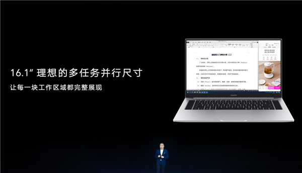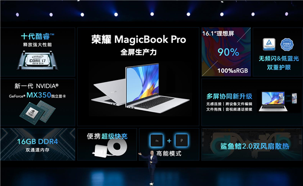 荣耀发布的第一款产品是MagicBook Pro 2020笔记本,这是一款16.1英寸的大屏笔记本,生产力更强悍,而且这次边框更窄,4.9mm三面窄边框实现了90%的屏占比。