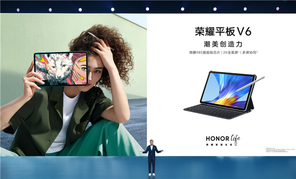 荣耀推出的第二款产品是荣耀V6平板,这是一款5G平板,使用了麒麟985 5G SoC处理器,10.4寸2K分辨率屏,屏占比为84%,通过了德国莱茵低蓝光认证及国家眼科工程中心护眼认证,7250mAh电池。