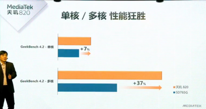 根据官方公布的数据,天玑 820 的多核性能比骁龙 765G 高 37% 左右。另外借助搭载的独立 AI 处理器 APU3.0,它的苏黎世 AI 跑分也大幅领先于骁龙 765G(大概 3 倍)。
