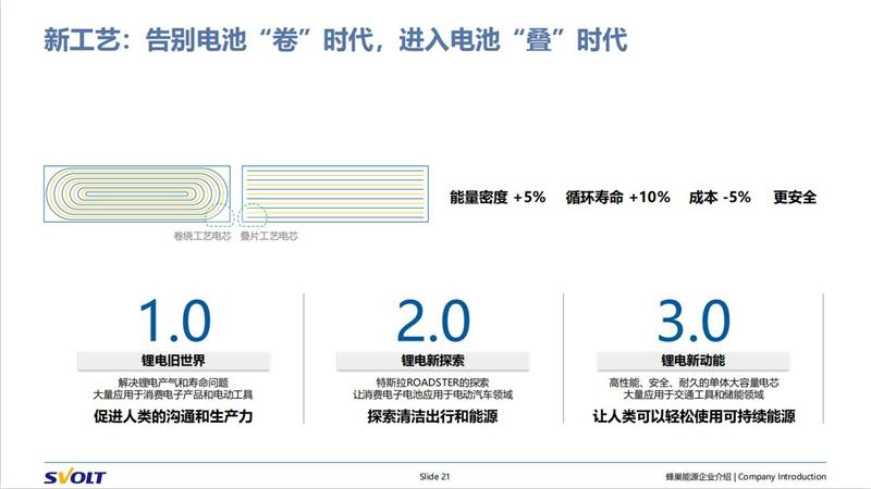 传统电池企业在生产工艺上大多采用了卷绕的方法,蜂巢能源则将高速叠片工艺应用于方形铝壳电芯。和传统卷绕工艺相比,叠片工艺所生产的电芯能量密度可提高5%,并且还能获得全生命周期内更低的变形和膨胀,循环寿命提升了10%。