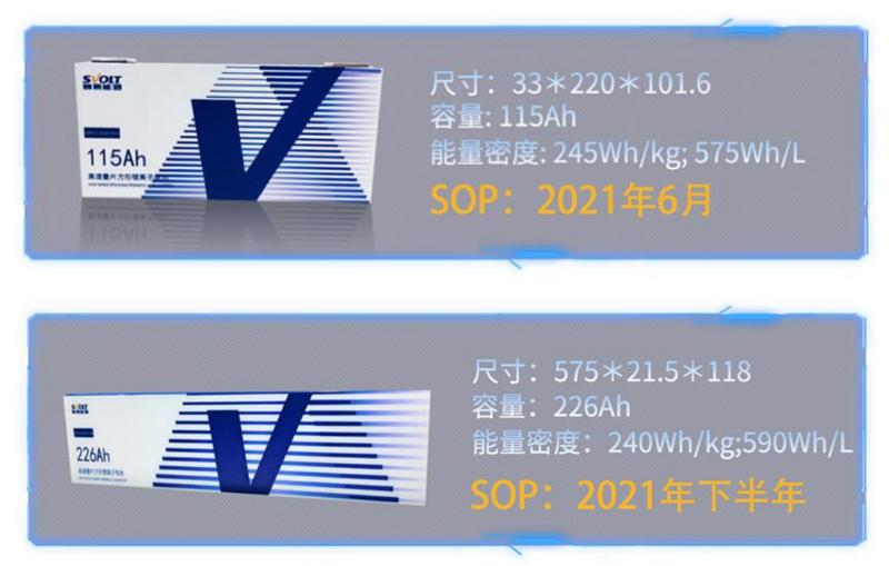 蜂巢能源推出了两款产品,第一款产品是基于590模组的电芯所设计,其容量为115Ah,电芯的能量密度达到了245Wh/kg,预计将在2021年6月份整体推出。第二款为L6薄片无钴长电芯,其容量为226Ah, 电芯能量密度为240Wh/kg,预计可以在2021年下半年实现量产。