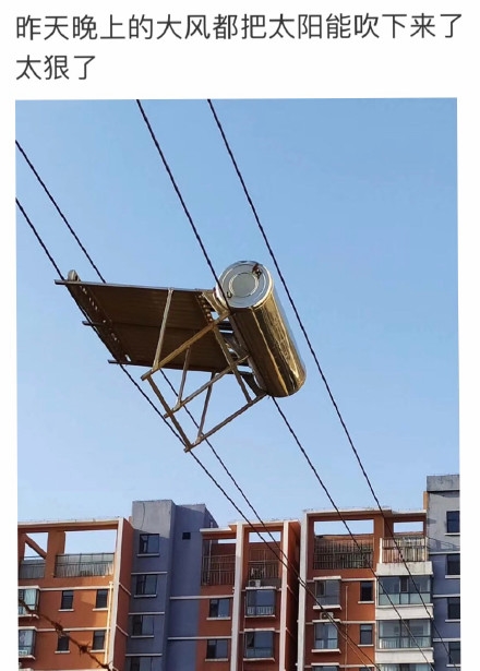 这并不是个例,这两天山东被吹落的太阳能恐怕数不胜数,正应了杜甫老人家那句“高者挂罥长林梢,下者飘转沉塘坳。”遇到这种天气,体重不过百的小伙伴能不出门就不出门了吧。