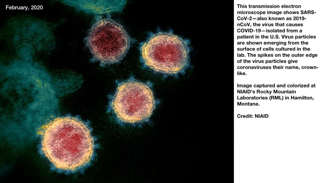 上图是2月份美国科学家拍摄的冠状病毒的大头照,可以清晰的看到表面“花冠的出现”,这是一个伪彩照片,很好的标出了“花冠”的存在。