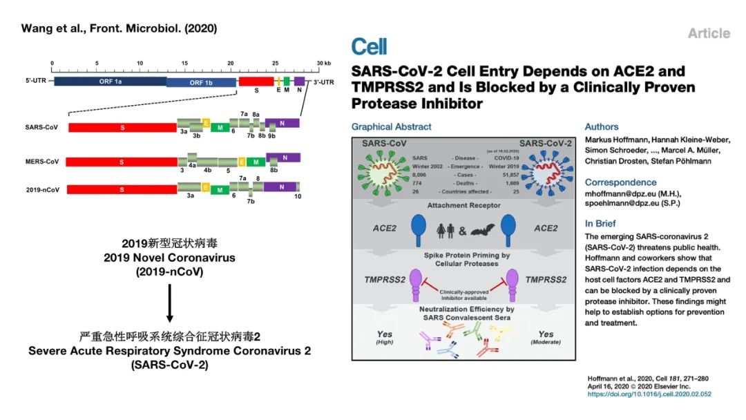 正是由于我们对于病毒的序列的解读,我们马上就可以知道它和17年前的宿敌SARS冠状病毒是近亲。都不需要告诉大家怎么看这个图,可以看出它们是蛮像的。它不仅和SARS很像,和10年前的MERS也有关系。这也说明了我们不能小瞧这个病毒,它可能具有巨大的破坏力。由于与SARS的相似性,国际病毒命名委员会,将原来我们把它叫做2019新型冠状病毒改名严重急性呼吸系统综合症冠状病毒2即SARS-CoV-2。SARS-CoV-2表明它跟原来SARS病毒之间的关联性还是比较近的。前不久德国科学家的论文也说明这个新的SARS冠状病毒和原先的SARS病毒确实在攻击细胞的时候采用的策略极为相似,通过进攻同样的蛋白来侵入细胞。而且还发现之前SARS病毒的抗体对新病毒也具有一定的中和作用,揭示两种病毒的高度相关性。