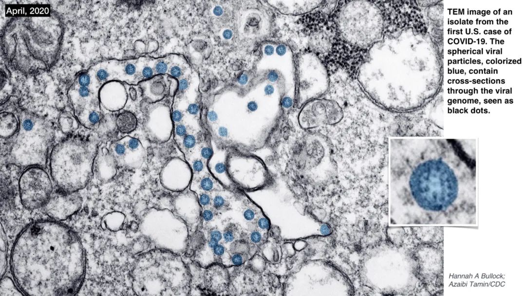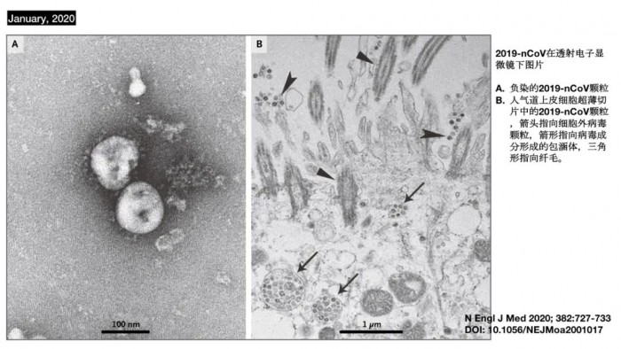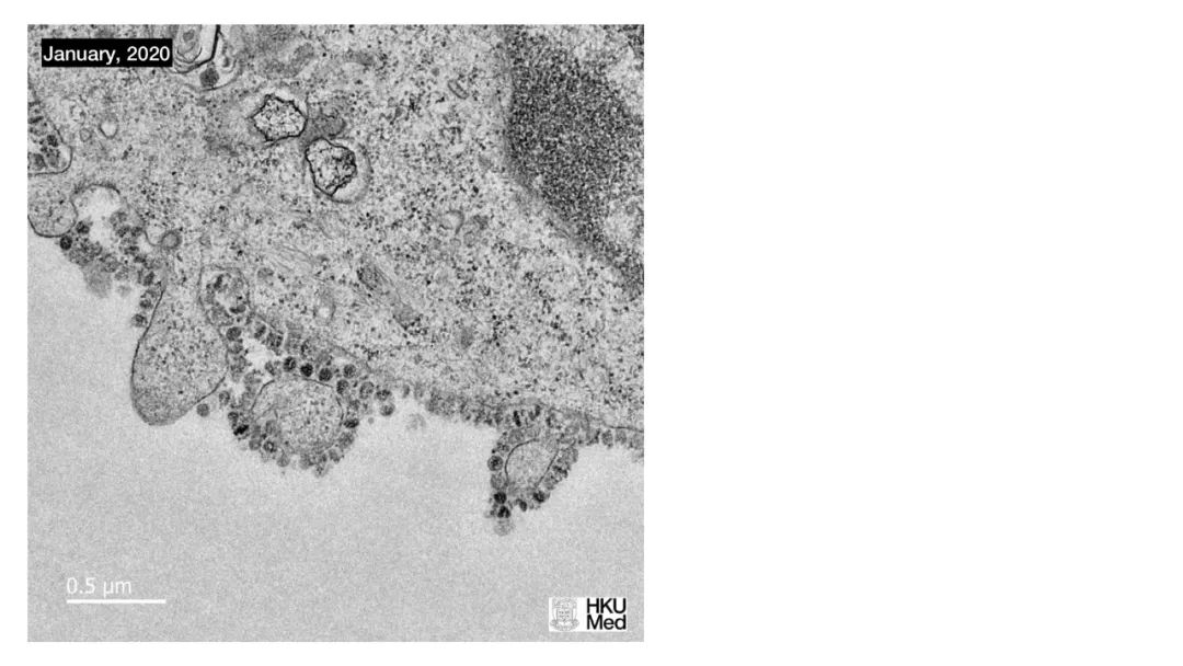 上图是香港大学的科学家1月份看到的冠状病毒,这个病毒已经完成了复制,从细胞里面释放出来。