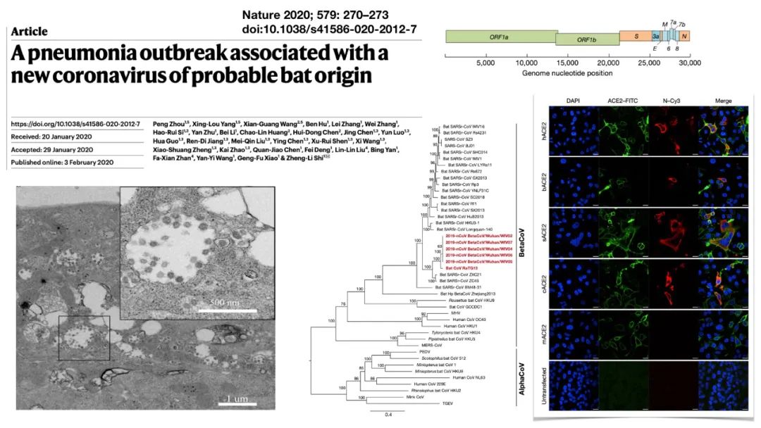 让我们回到今年一月份。一月下旬,几篇中国科学家撰写的科学论文相继面世,使得我们可以全面了解这一个新的病原体。新闻报导,只是新闻,但是读科学论文,可以感受到细节的重要性。首先,1月24日的《新英格兰医学杂志》上,我们看到了这个病毒的全基因组序列。从序列上,生物学家可以很明确地判断这是冠状病毒,而且从序列分析上可以判定这是一个新病毒,在人类历史上以前没有发现过的新病毒,归属到Beta属,是感染人类的冠状病毒科的第七个成员。