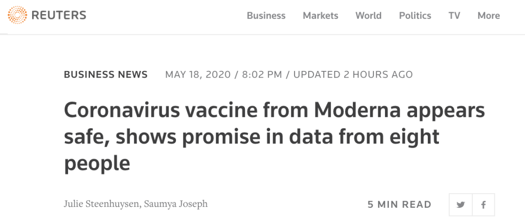 据路透社报道,当地时间5月18日,美国生物技术公司Moderna宣布,初步实验数据显示,注射了该公司正在研发的新冠疫苗后,所有45名参与者的体内全部产生了抗体,而其中8人的属于“中和抗体”,这是应对病毒最有效的抗体。