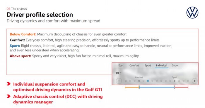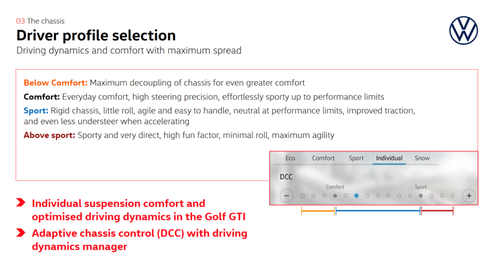 除了 VAQ 差速器,GTI 的 DDM 驾驶模式控制,还会同时调整车辆的一切行驶相关系统:引擎、变速箱、转向助力、DCC 可调避震器等等。