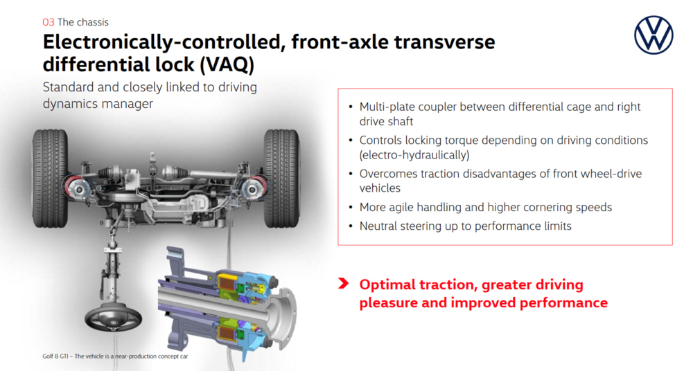 在上一代(第七代)GTI 上,VAQ 差速器被包含在 Performance 性能包中供选装,而到第八代 GTI 随着动力增加而变成了标配。GTI 是一辆前驱车,一个可以 100% 锁死的前轴限滑差速器,首先是可以更好地帮助你转向入弯;其次在你希望的时候,锁死两侧前轮间的转速差,让转向过度的状态能更好看更持久。谁说前驱车就不能漂移了?
