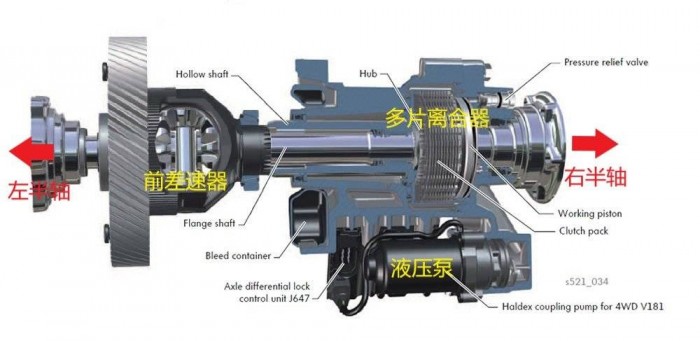 VAQ 则不同,这是大众专为前驱车研发的一种限滑差速器,换句话讲就是有实体的物理系统。只是原理和庞大的机械式限滑差速器不同,大众的做法是独立于前轴开放式差速器本体,在右侧半轴上安装一个多片式离合器。由液压泵控制离合器的压紧程度,进而控制两侧半轴的动力输出比例,在需要时完全压紧起到限滑作用。由于前驱车的前机舱空间比较紧张,再加上成本的限制,VAQ 这种紧凑的系统有了用武之地。