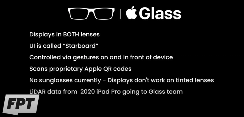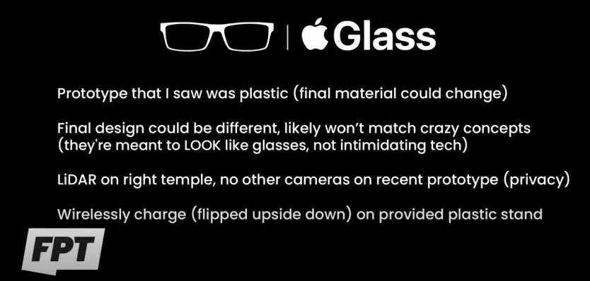 Apple Glass 需要与 iPhone 配对使用,类似于初代 Apple Watch。目前的 Apple Glass 原型机配备了激光雷达扫描仪,支持无线充电。