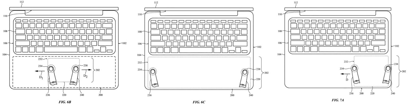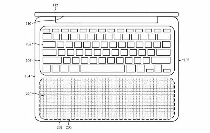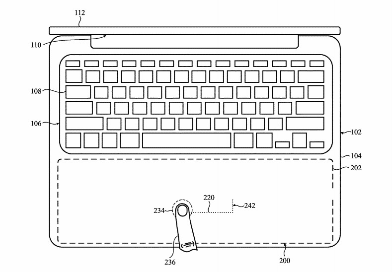 在周二美国专利商标局授予苹果的一项名为 "用于电子设备的动态输入面 "专利中,苹果提出了将目前的触控板完全去掉,转而将MacBook机身的整个下半部分变成一个大的触控板。苹果公司的理由是,巨大的触控面积可以为用户提供完美尺寸的触控板,而不是简单地提供一个大的输入区域。
