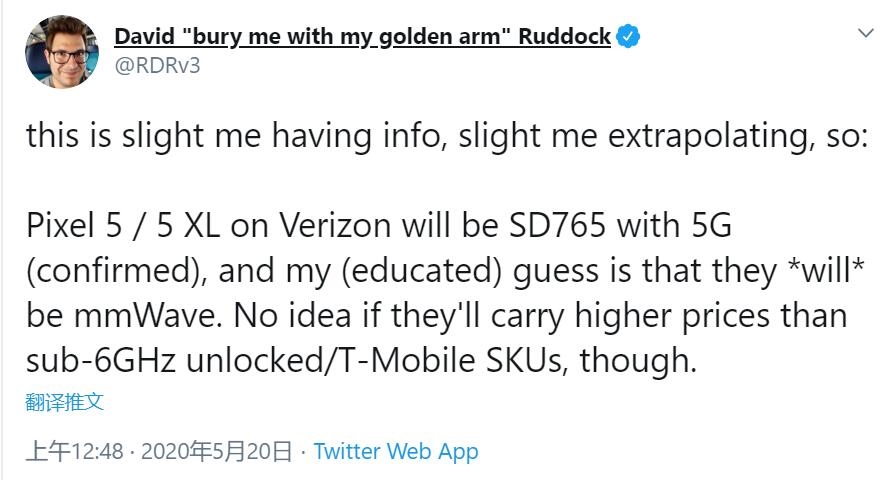 越来越多的证据表明,谷歌Pixel 5不会使用高通骁龙865旗舰平台,而是选择了骁龙765G中端平台。5月20日消息,Android Police主编David Ruddock在推特确认,谷歌Pixel 5搭载的是高通骁龙765G移动平台,他声称Pixel 5 XL也是使用了这一平台。
