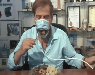 据介绍,这种口罩有一个远程控制杆,挤压控制杆,口罩前面会打开一个狭槽,食物就可以通过。进食固体食物时,可以像《吃豆人》里的街机游戏一样,瞬间吃掉。
