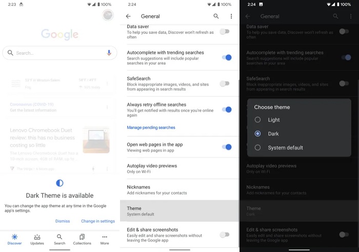 在 Android 10 和 iOS 13 设备上,谷歌应用已支持系统的全局主题。切换之后,界面的大部分将变成灰暗的色调。