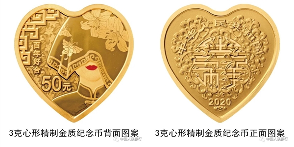 其中,3克心形金质纪念币为精制币,含纯金3克,外接正方形边长18毫米,面额50元,成色99.9%,最大发行量10000枚。背面图案为新娘、百合、窗棂等组合图案,并刊“百年好合”字样及面额。