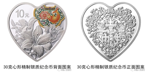 而30克心形银质纪念币为精制币,含纯银30克,外接正方形边长40毫米,面额10元,成色99.9%,最大发行量20000枚。背面图案为百合与同心锁等组合图案,并刊“百年好合”字样及面额。