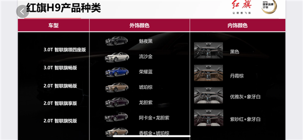 众所周知,红旗于今年年初在人民大会堂发布了旗下中大型轿车——红旗H9,新车是由中国设计师丁杨峰以及前劳斯莱斯设计总监贾尔斯·泰勒共同打造,气场和颜值相当在线,被网友誉为“中国版的劳斯莱斯”。近日,有国内媒体曝光了一组红旗H9培训资料图片,根据图片显示红旗H9将推出5款配置车型,分别搭载2.0T+48V和3.0L机械增压发动机,其中2.0T车型共三款,3.0L机械增压车型共两款。
