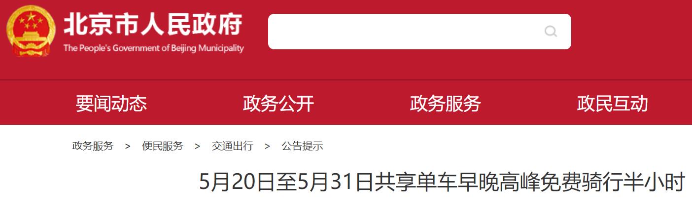 5月20日消息, 记者从首都之窗了解到,为适应疫情防控进入常态化阶段和全面复工复产的新形势,鼓励、培育市民通过骑行+公共交通的方式通勤,北京市交通委联合美团、青桔、哈啰等共享单车企业,推出早晚高峰时段免费骑行半小时共享单车的激励措施,鼓励市民绿色出行。
