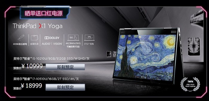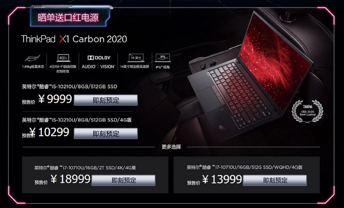 今天下午举行的发布会中,联想正式宣布了2020年款ThinkPad X1 Carbon 和 ThinkPad X1 Yoga,是极致便携+高端商务的代表。这两款产品都支持杜比视界和杜比全景声音响系统,目前已经在京东接受预订,预计最晚在6月1日17时发货。