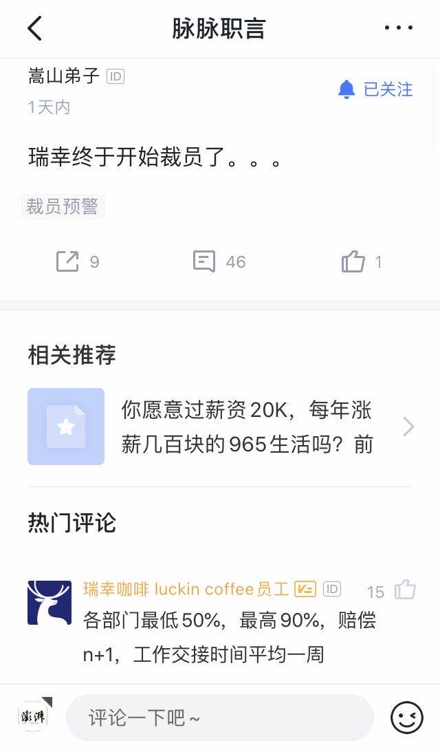 就裁员的传闻,瑞幸咖啡在当天下午回应澎湃新闻(www.thepaper.cn)记者称,“随着公司业务战略调整,个别部门涉及人员的转岗和优化,一些员工离职属于正常的人员流动,主要是在执行2019年绩效考核的末尾淘汰机制。对于离职员工,瑞幸咖啡按照国家相关法律进行赔偿。”