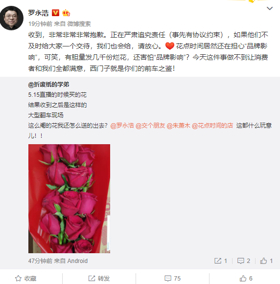 今天下午,罗永浩在微博逐条转发网友的晒单吐槽,内容主要是不少网友通过罗永浩直播间购买的520鲜花,到货之后发现鲜花不鲜,变成了残花、烂花。对此,罗永浩连用三个非常表示抱歉。他回应,正在严肃追究责任(事先有协议约束),如果他们不及时给大家一个交待,我们也会给,请放心。