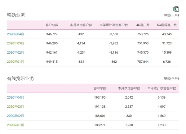 中国移动方面,移动出账用户数为9.467亿,当月净增43.2万,但由于前两个月减少过多,今年累计净减了355.0万,其中4G用户数7.537亿,今年净减428.9万,但是3-4月份两连增,5G用户数已达4374.5万。