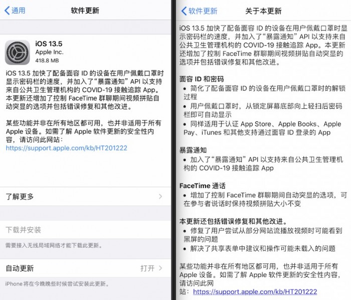iOS 13.5 加快了配备面容 ID 的设备在用户佩戴口罩时显示密码栏的速度,并加入了“暴露通知” API 以支持来自公共卫生管理机构的 COVID-19 接触追踪 App。本更新还增加了控制 FaceTime 群聊期间视频拼贴自动突显的选项并包括错误修复和其他改进。