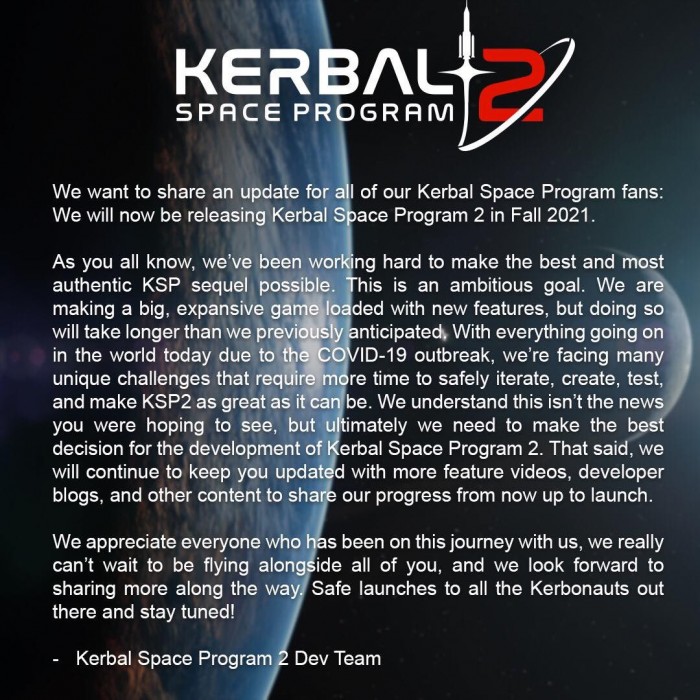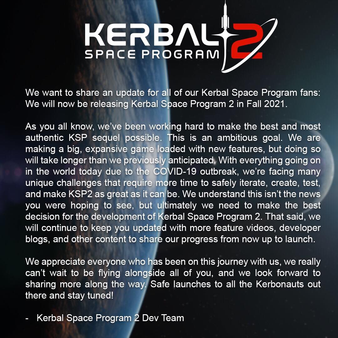在去年德国科隆游戏展上,《坎巴拉太空计划2(Kerbal Space Program 2)》突然宣布,让不少喜欢前作的玩家非常吃惊。按照原计划,新增大量内容的《坎巴拉太空计划2》应该在2020年内上市,然而受到新冠肺炎疫情影响,这款游戏已经正式延期到2021年秋季。