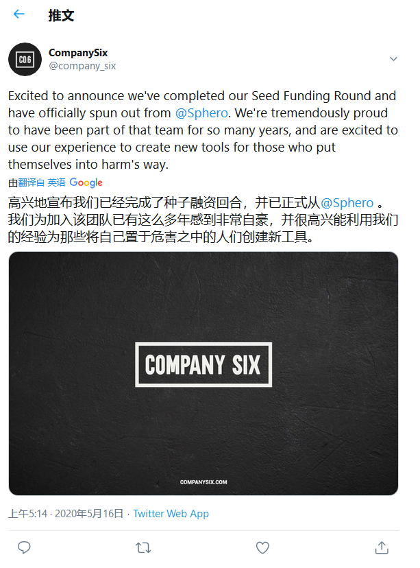 本周三,Sphero表示已经成功拆分出一家名为“Company Six”的公司,团队成员来自于Sphero的公共安全部门,目标是让产品适合急救需求。Sphero表示,这家初创公司将制造出比玩具机器人更耐用、功能更专业的机器人。