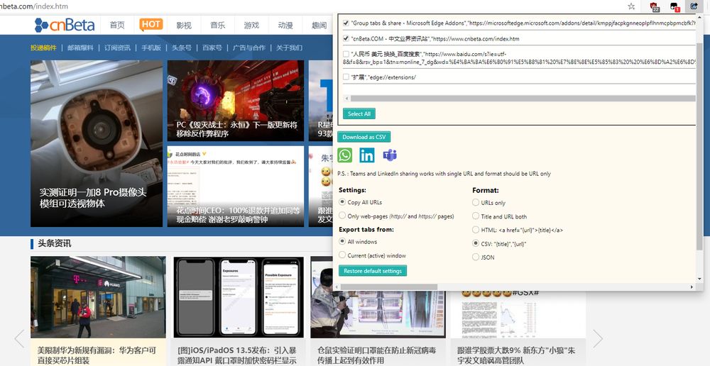 虽然这个扩展的名称听上去应该是和Chrome的标签页群组功能接近,但这款扩展程序的目的却是完全不同的。通过这款扩展程序,允许用户对当前运行的标签页进行选择,然后以HTML、CSV、JSON、JSON和仅URL五种格式进行分享。
