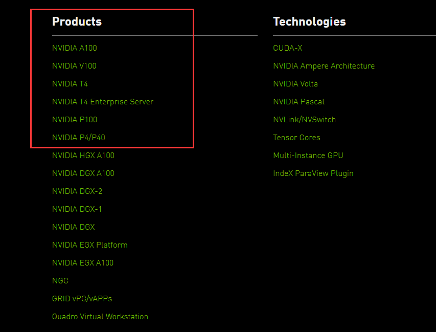 目前在NVIDIA全球官网上,Tesla字样已经完全消失,除了A100、T4,更早发布的伏特架构Tesla V100、帕斯卡架构Tesla P100/P4/P40也已分别改名为V100、P100/P4/P40。