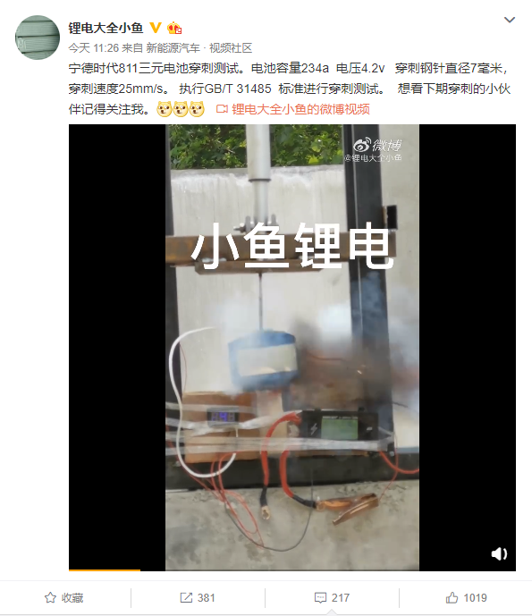 据博主@锂电大全小鱼介绍,其进行穿刺实验的电池为宁德时代811三元锂电池单体,电池容量234a电压4.14v(满电为4.2V),穿刺钢针直径7毫米,穿刺速度25mm/s。执行GB/T 31485标准进行穿刺测试。