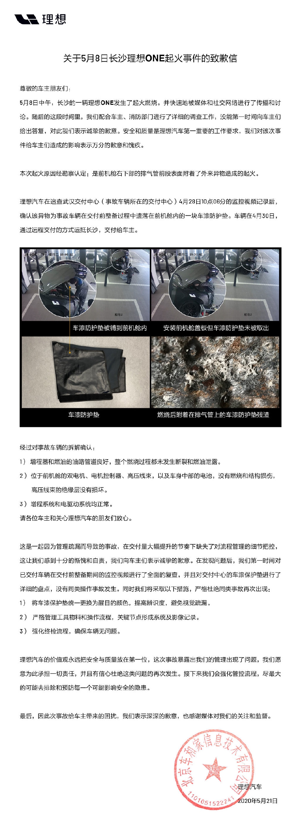 今天傍晚,理想汽车就5月8日在长沙发生的理想ONE当街自燃事故致歉,并公布调查原因,简单来说,事故是由于理想工作人员在交付前的整备工程中,不慎将车漆防护垫遗落在前机舱内而导致的意外。对于时隔这么久才做出回应,理想解释,“我们配合车主、消防部门进行了详细的调查工作,没能第一时间向车主们给出答复”。