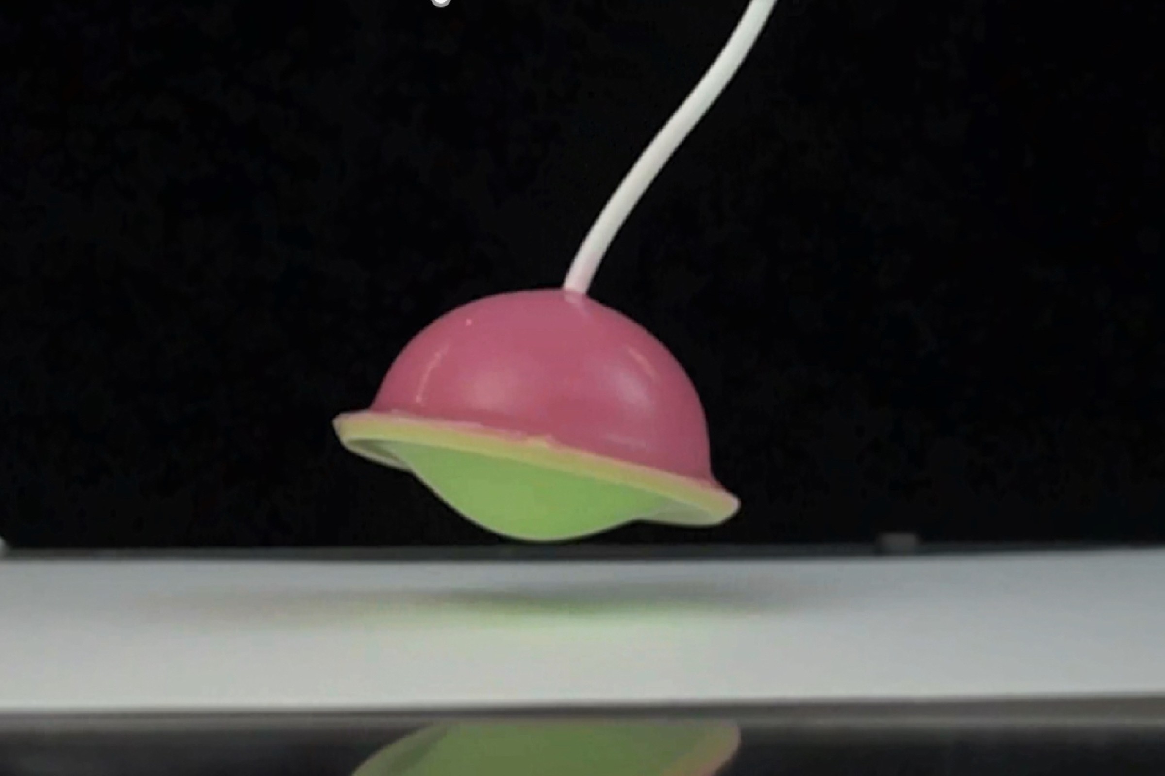 但与此同时,较小的软帽会向下压并膨胀,此时,凹面向凸面快速释放能量。这一过程被称为壳体屈曲,它会让软帽用力撞击地面从而将整个致动器弹射到空中。