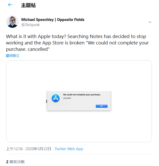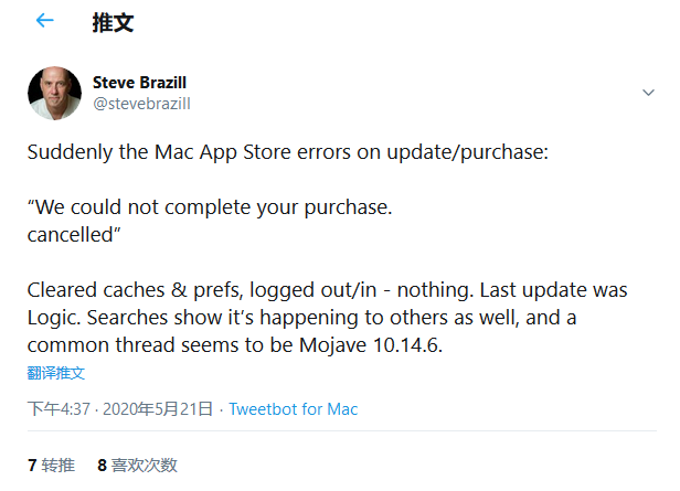 尽管反馈用户规模并不大,但部分macOS Mojave 10.14用户都遇到了相同的问题:无法从Mac App Store下载应用程序。当用户尝试购买或者下载应用程序的时候,用户会收到“我们无法完成你的购买。已取消。”的错误通知。当用户尝试更新应用时,也出现了该错误。