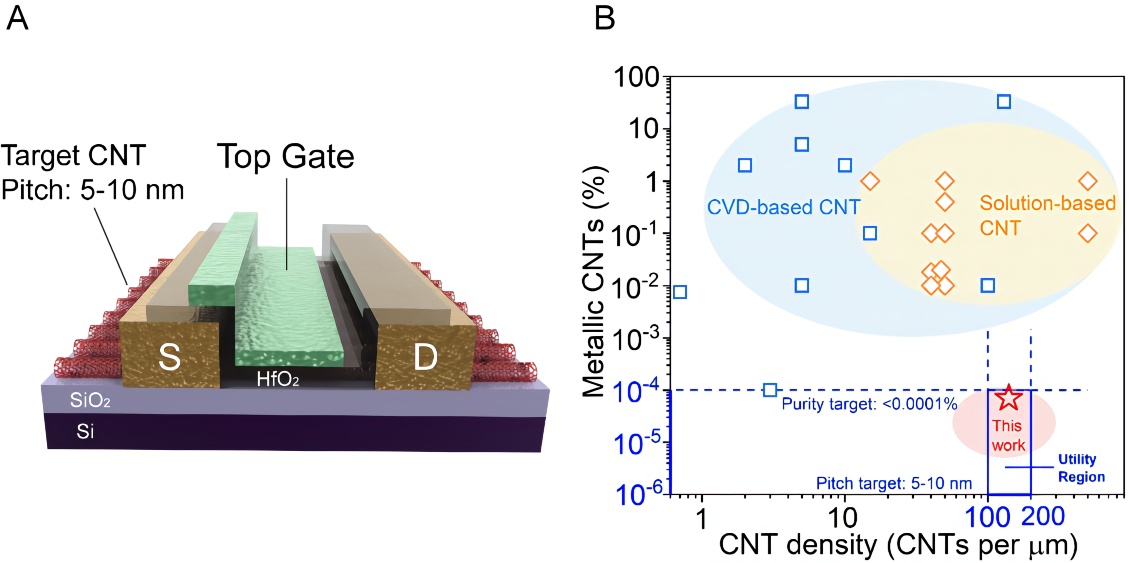尽管过去20年里,学术界发展了多种制备、提纯、排列碳纳米管的方法,但是始终无法接近这个目标。这使得碳纳米管晶体管和电路的实际性能远低于理论预期,甚至落后于相同技术节点的硅基技术至少一个量级。