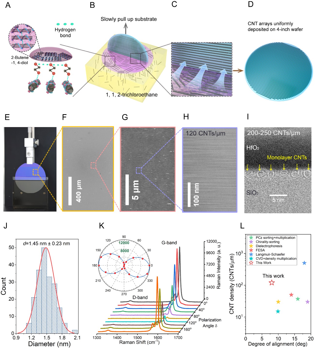 接着,在排列方面,研究团队提出结合维度限制自排列法(Dimension-Limited Self-Alignment),在4寸晶圆上制备出了密度120/微米、半导体纯度高达99.99995%、直径分布1.45±0.23nm的碳纳米管阵列,理论上达到了超大规模碳纳米管集成电路的需求。