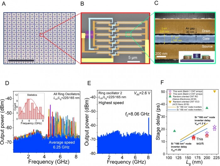 基于此种材料,课题组批量制备了场效应晶体管和环形振荡器电路,100纳米栅长的碳基晶体管跨导和饱和电流分别达到0.9mS/μm和1.3mA/μm,室温下亚阈值摆幅为90mV/dec;批量制备出了五阶环形振荡器电路,成品率超过了50%,最高振荡频率达到8.06GHz,远超已发表的基于纳米材料的电路,且首次超越相似尺寸的硅基CMOS器件和电路。