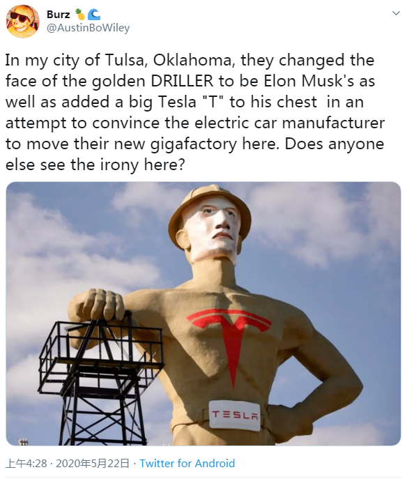 为了与其它城市争抢建造特斯拉 Cybertruck 电动皮卡的新工厂,俄克拉荷马州的塔尔萨市(Tulsa)正在全力以赴。除了抛出减税支持等橄榄枝,近日又有网友发现当地标志性的 Golden Driller 钻井工人雕像也被赋予了新的面貌 —— 描绘了神似伊隆·马斯克(Elon Musk)的脸、胸前打上了大红色的 T 型 Logo、腰带皮扣位置更是直白地印上了 TESLA 的字样。