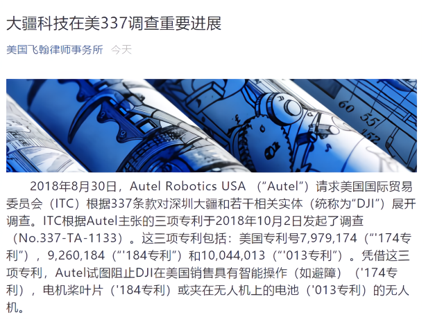 据早前报道,这一案件自2018年8月30日,由深圳道通在美子公司Autel Robotics向ITC发起请求,ITC根据Autel主张的三项专利(美国专利号分别为US7,979,174,US9,260,184和US10,044,013)于2018年10月2日开始调查。而据该律所介绍,凭借这三项专利,Autel试图阻止大疆在美国销售具有智能操作(如避障)('174专利),电机桨叶片('184专利)或夹在无人机上的电池('013专利)的无人机。