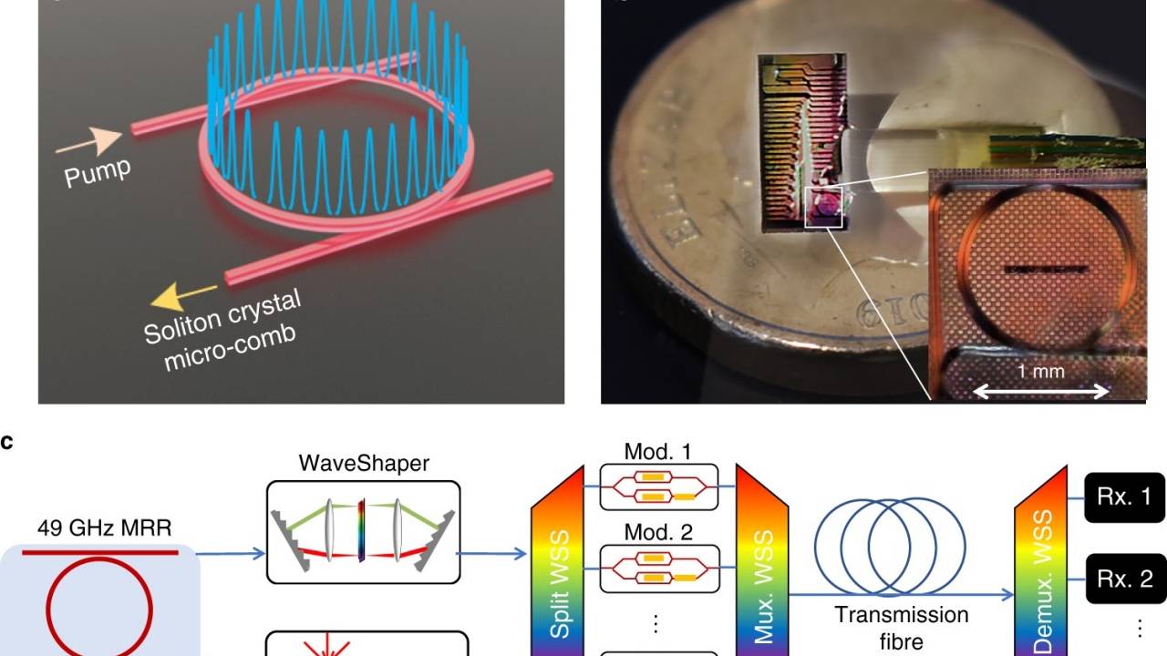 这个装置运用了80个独立的红外激光器,每个激光器都可以作为一个独立的通信通道。该团队由来自莫纳什大学、斯威本大学和皇家墨尔本理工大学的研究人员组成,他们使用76.6公里(47.6英里)的光纤对该技术进行了测试,设备安装在澳大利亚墨尔本的两个大学校园之间。