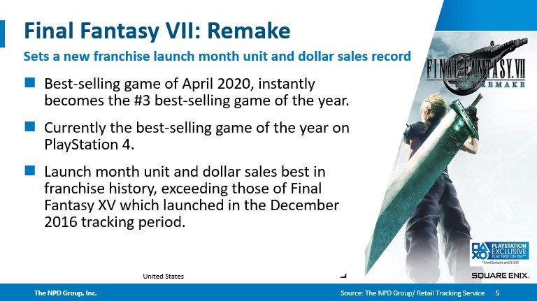 位居榜首的是《最终幻想7:重制版》,它也成为了今年迄今第三大最畅销游戏,现在是PS4年度最畅销游戏。不管是从销量还是收入上,《最终幻想7:重制版》都为《最终幻想》系列游戏创下了一个新的首发月记录(美国)。在此之前,这个记录被2016年12月发售的《最终幻想15》保持。位居第二的是《使命召唤16:现代战争》。