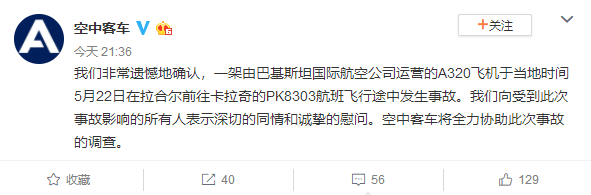 空客表示,我们非常遗憾地确认,一架由巴基斯坦国际航空公司运营的A320飞机于当地时间5月22日在拉合尔前往卡拉奇的PK8303航班飞行途中发生事故。