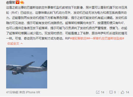 根据知名航空大V@瘦驼的爆料,从飞机坠毁前被拍到的照片来看,事故发生时飞机动力尽失,之前可能有起火嫌疑,并且飞行员有可能误判了飞机发动机的损伤程度,进一步加剧了事故。