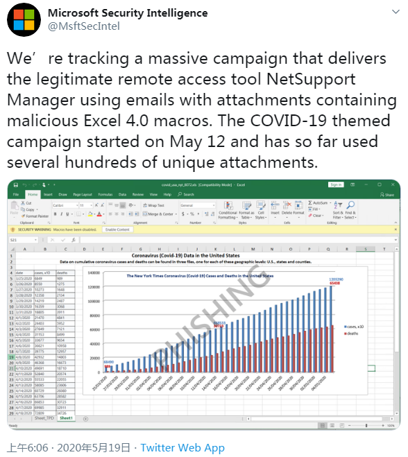 微软今日向用户发出了一则预警信息,提醒大家警惕利用 COVID-19 和 Excel 文件散播恐慌的“大规模”网络钓鱼活动。如果你无法分辨一封邮件的真实性,还请尽量避免下载打开附件、或贸然提交自己的个人信息。微软表示,这轮钓鱼邮件活动似乎始于 2020 年 5 月 12 日,恶意行为者假借约翰·霍普金斯中心之名,征集所谓的“世卫 COVID-19 状况报告”。