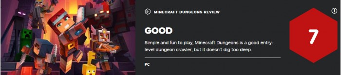 IGN表示,《我的世界:地下城》是一个美丽和欢乐的地下城闯关游戏,有着简单但可靠的系统。它的玩法极度保守,没有为这个类型带来任何的挖掘或锻造上的修改,以配合《我的世界》标志性的外观和感受。但这款游戏仍然很有魅力,很欢乐,很难因为它非常保守而挑它的错。有着海量的战利品和秘密地区等待你去发掘,以及越来越难的关卡解锁,《我的世界:地下城》在相对短暂的6-8小时故事模式之外还有着大量的重玩价值,但谁会为了故事模式而玩《我的世界》呢?