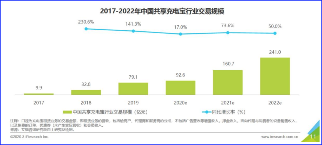 艾瑞预测,到2021年中国共享充电宝行业的市场规模达到160亿,到2022年增长到241亿,并且增幅还有50%。