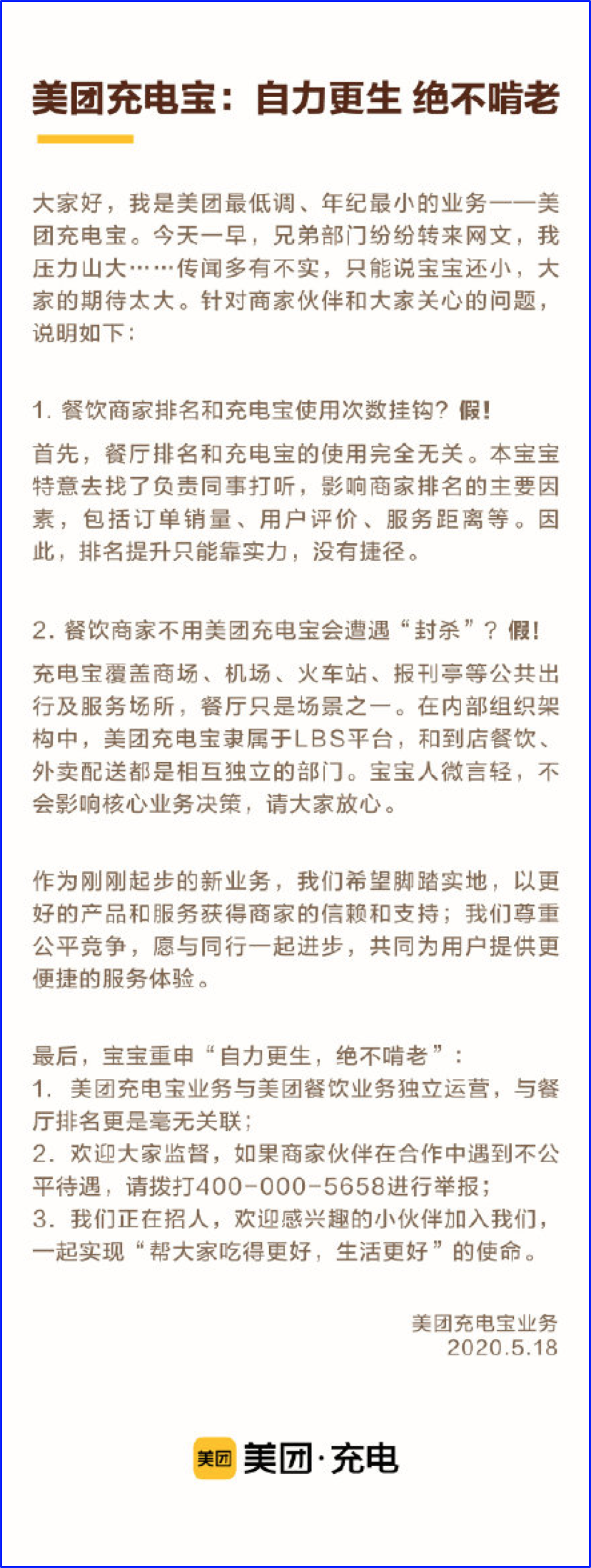 面对外界的争议,近期美团公开否认了餐厅排名和充电宝关联、餐饮商家不用美团共享充电宝会遭遇“封杀”的说法,明确表示“美团共享充电宝业务与美团餐饮业务独立运营,与餐厅排名更是毫无关联”。