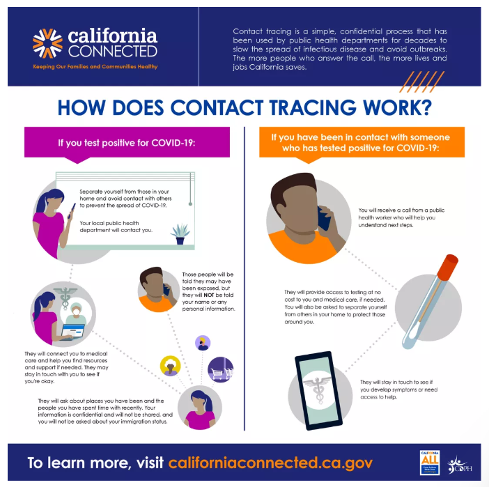 加州民众将收到来自 "CA COVID Team"的短信、电话和电子邮件。他们会询问民众的姓名、年龄、去过的地方和接触过的人,但绝不会询问你的财务信息、社会安全号码或移民身份。该计划被认为将有助于通过发现和隔离新的病例,阻止新冠病毒的传播。